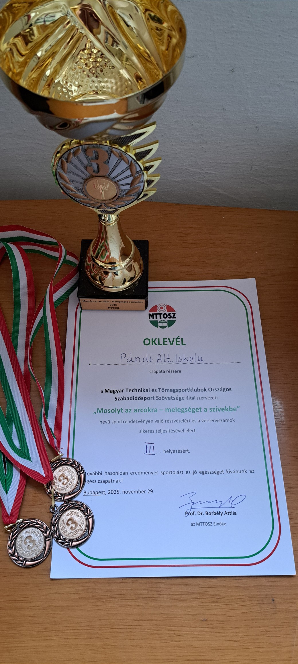 A Pándi Általános Iskola tanulói eredményesen teljesítettek a Magyar Technikai és Tömegsportklubok Országos Szabadidősport Szövetsége által szervezett "Mosolyt az arcokra – melegséget a szívekbe" rendezvényen, és III. helyezést értek el.🥉🏆